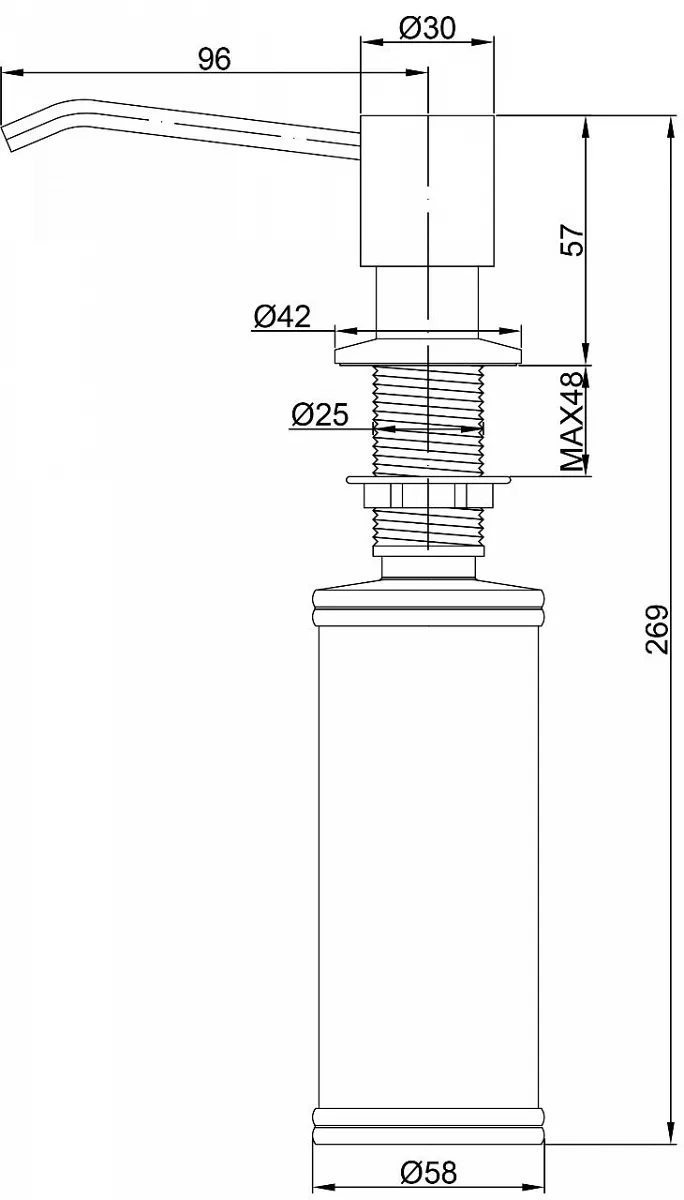 Заправка моющим средством происходит без откручивания ёмкости. Для пополнения колбы моющим средством просто вытяните верхнюю часть дозатора движением вверх и залейте моющее средство в открывшуюся горловину колбы. - Дозатор подходит для установки в столешницы толщиной до 48 мм.
