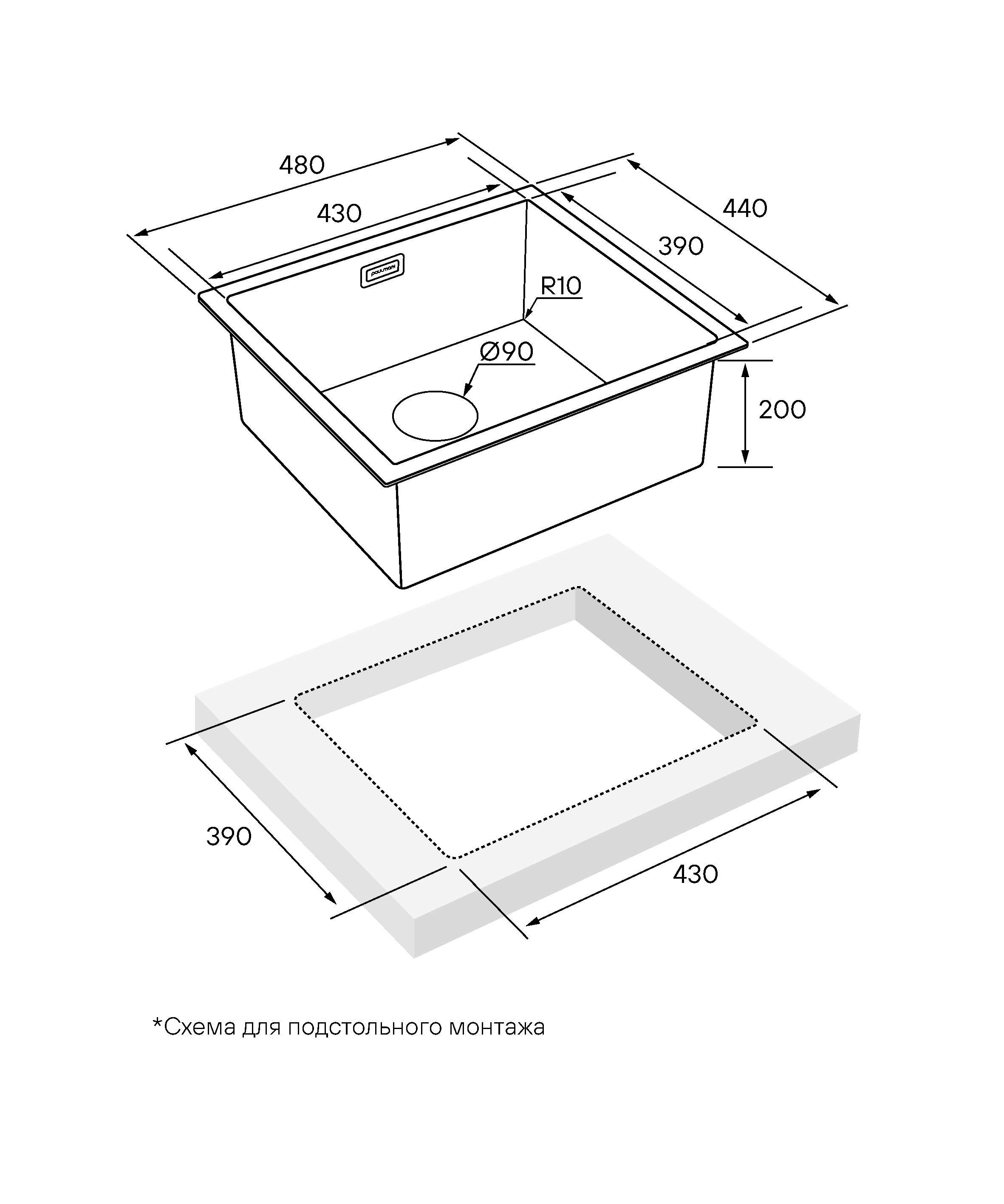Типы монтажа: универсальный (подстольный / врезной / вровень со столешницей).