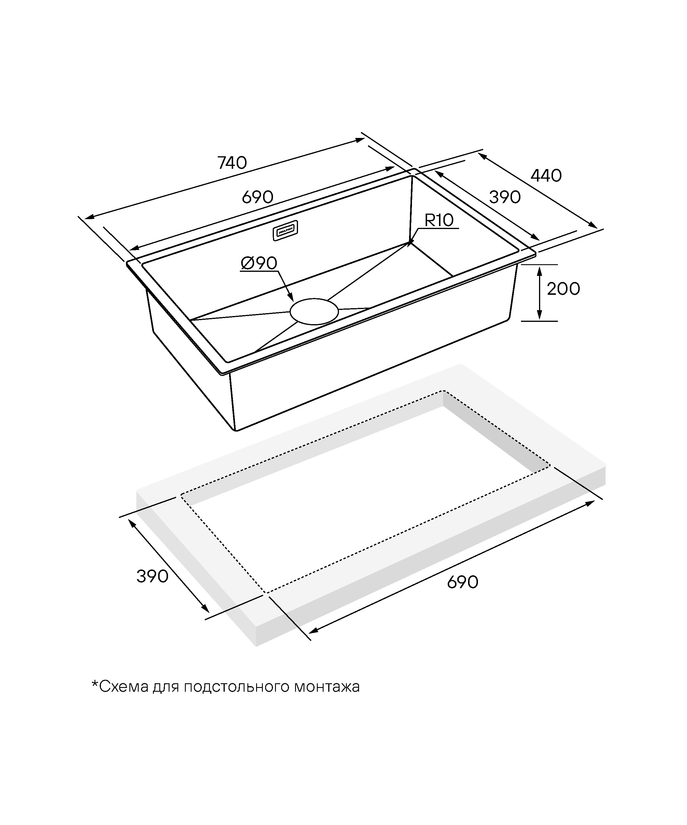 Типы монтажа: универсальный (подстольный / врезной / вровень со столешницей).