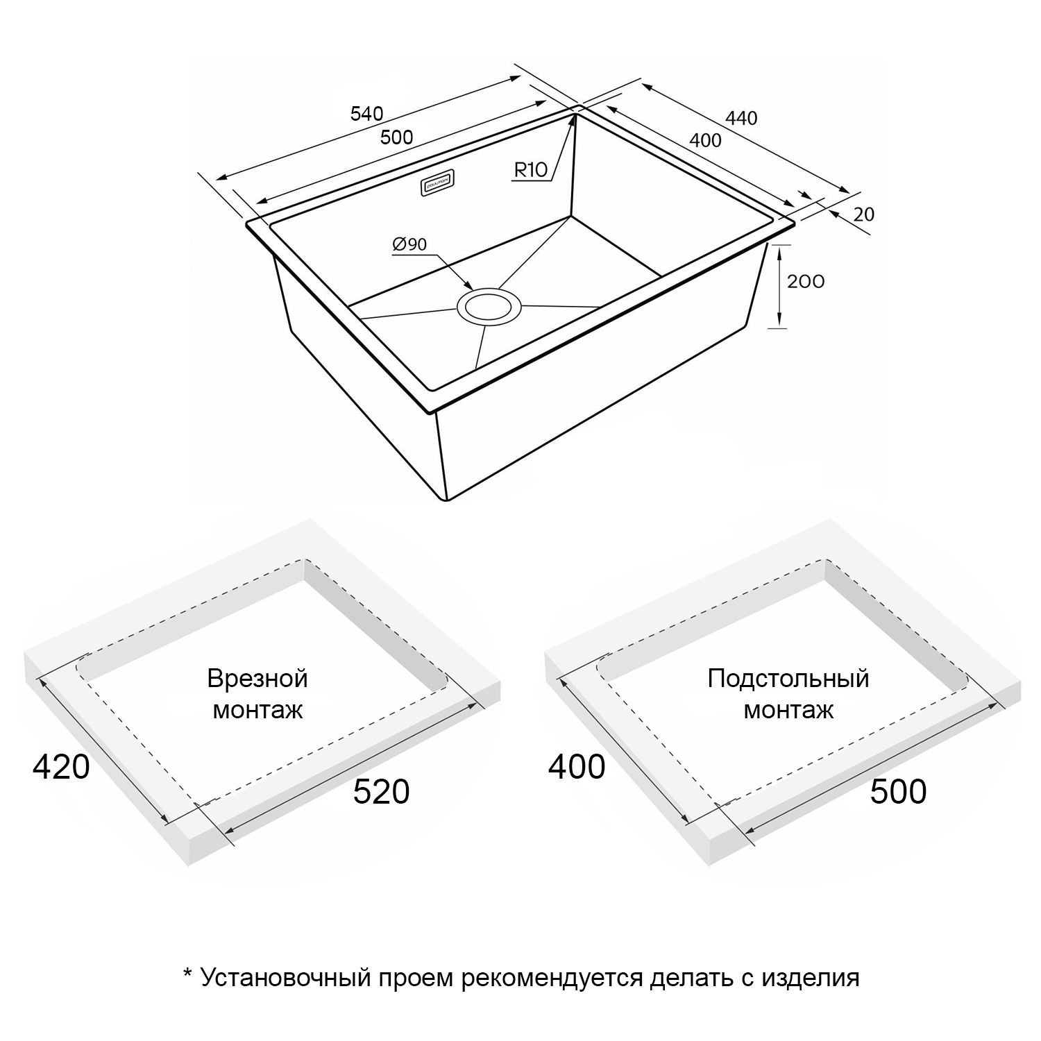 Мойки LASSAN UNI могут быть установлены как врезным способом поверх столешницы, так и под столешницу (подстольный монтаж).