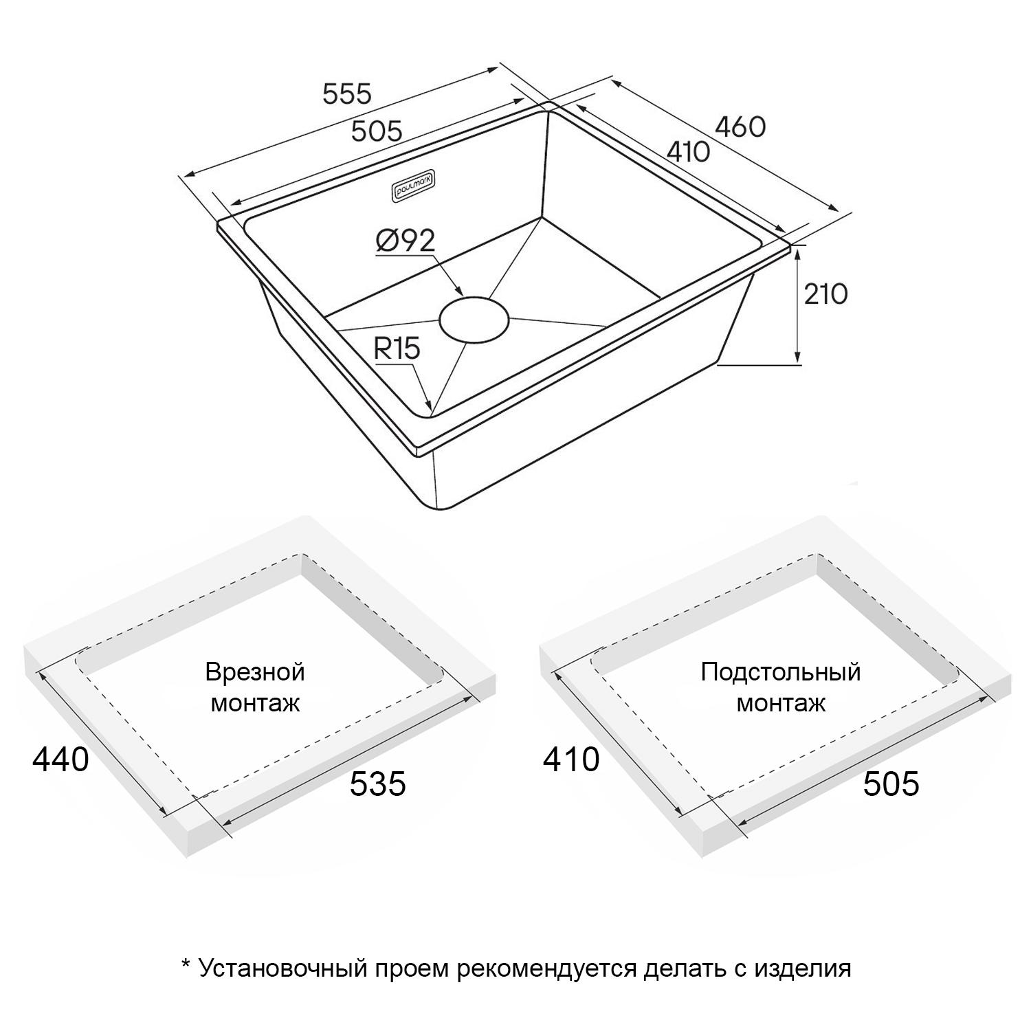Мойка создана как для современного способа монтажа под столешницу, так и для классического врезного монтажа.