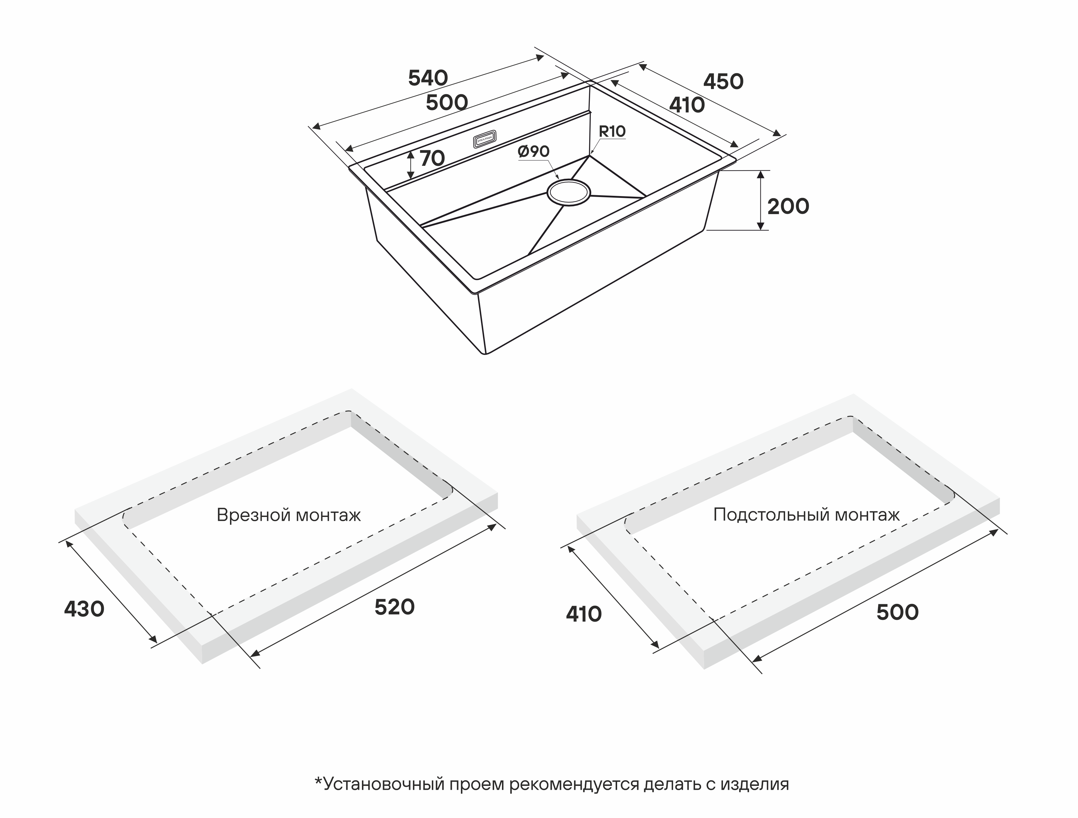 Толщина мойки 1,2 мм по всей поверхности. Ручной метод производства и ровный плоский кант мойки позволяют устанавливать NEXT-MULTI SINK 54 UNI поверх столешницы, подстольным способом, вровень со столешницей и «под ламинат».