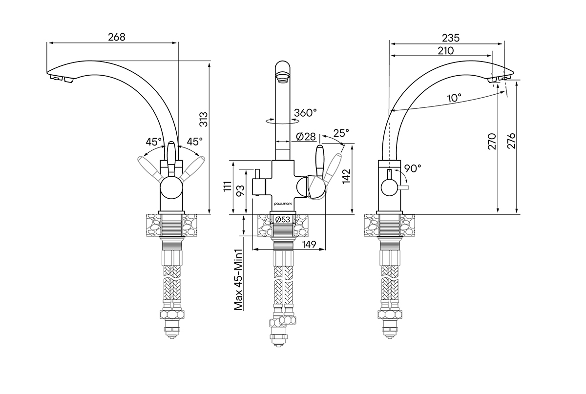 Двурычажный смеситель в классическом дизайне с подключением к системе фильтрации питьевой воды. Выполнен из латуни с долговечным керамическим картриджем 35 мм.