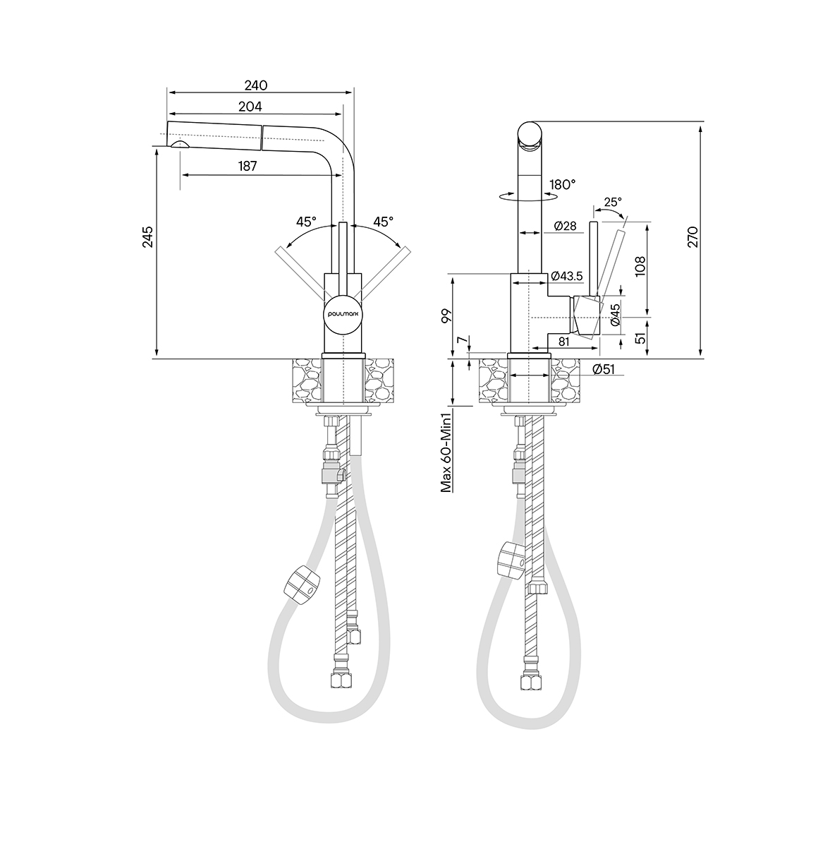 Конструкция смесителя с вытяжным шлангом значительно облегчает процесс мойки посуды или продуктов любого размера и формы.
