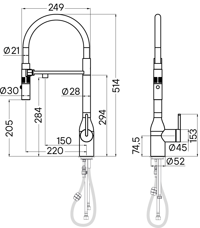 Смеситель для кухни MAGNETO ONE оснащен функциями подключения системы фильтрации питьевой воды, высоким гибким силиконовым изливом с магнитным механизмом крепления и функцией переключения режимов подачи воды струя/душ, управление которой производится кнопкой на конце излива. Рычаг 2в1 управляет подачей водопроводной воды и очищенной воды из фильтра.