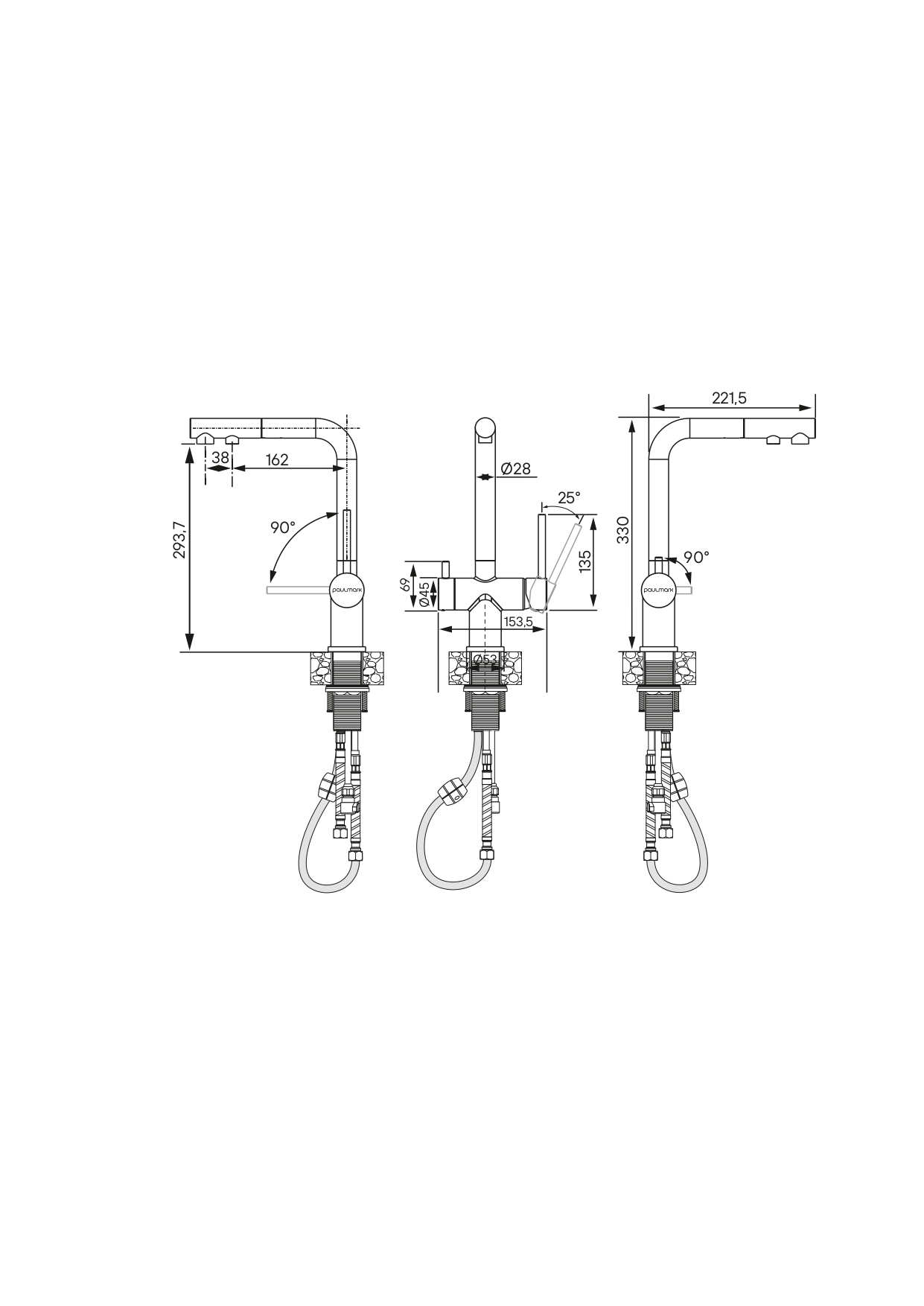 SERPENTINE оснащён функцией TRINKWASSER - излив смесителя имеет встроенный независимый канал для питьевой воды из фильтра, таким образом питьевая и водопроводная вода не смешиваются. Управление питьевой водой осуществляется отдельным рычагом, расположенным слева. Для пуска водопроводной воды используется большой рычаг справа.