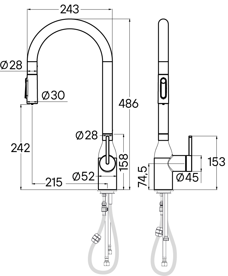 Выдвижной излив дает свободу в наполнении емкостей не только в мойке, но и рядом с мойкой на столешнице. Кнопка на конце излива позволяет управлять подачей питьевой воды и переключением режимов струя / душ одной рукой.